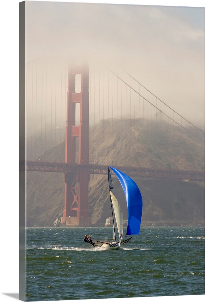 <p>A Skiff sails in the San Francisco Bay near the Golden Gate Bridge</p>