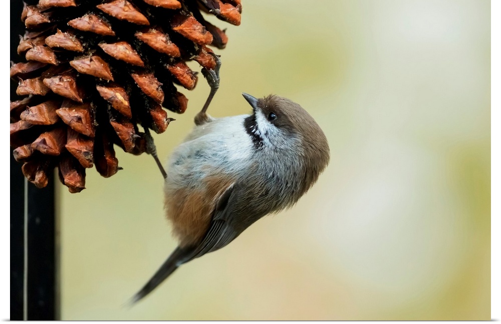 <p>A small bird clings to a pine cone, Alaska, United States of America.</p>