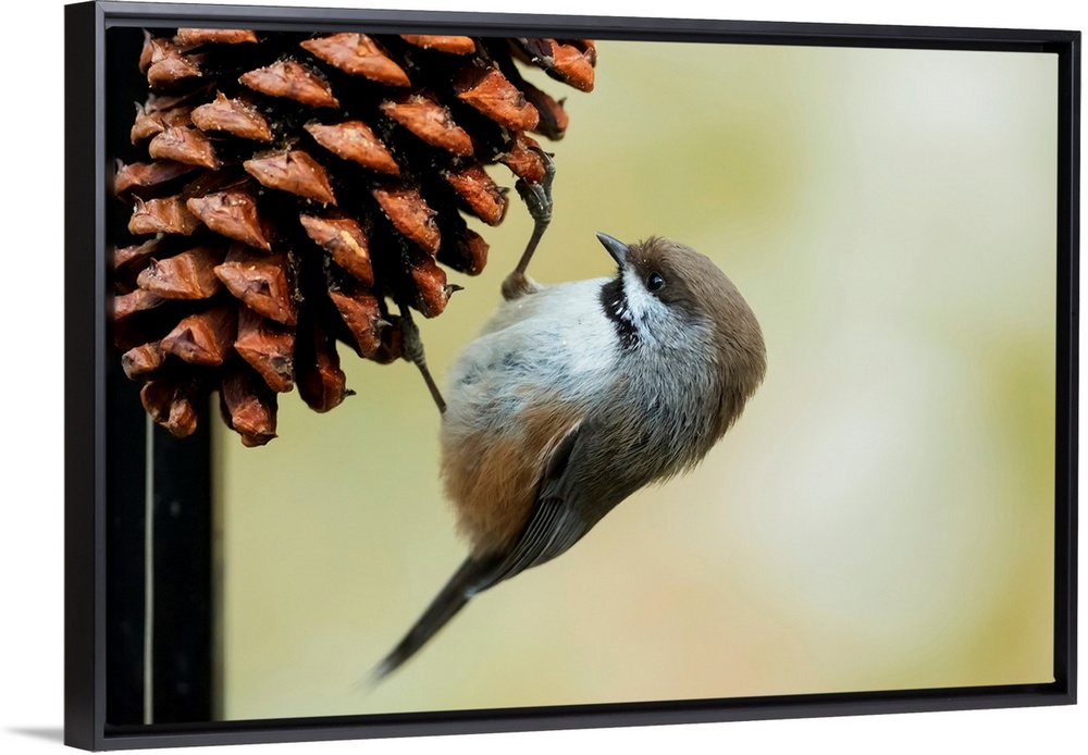 <p>A small bird clings to a pine cone, Alaska, United States of America.</p>