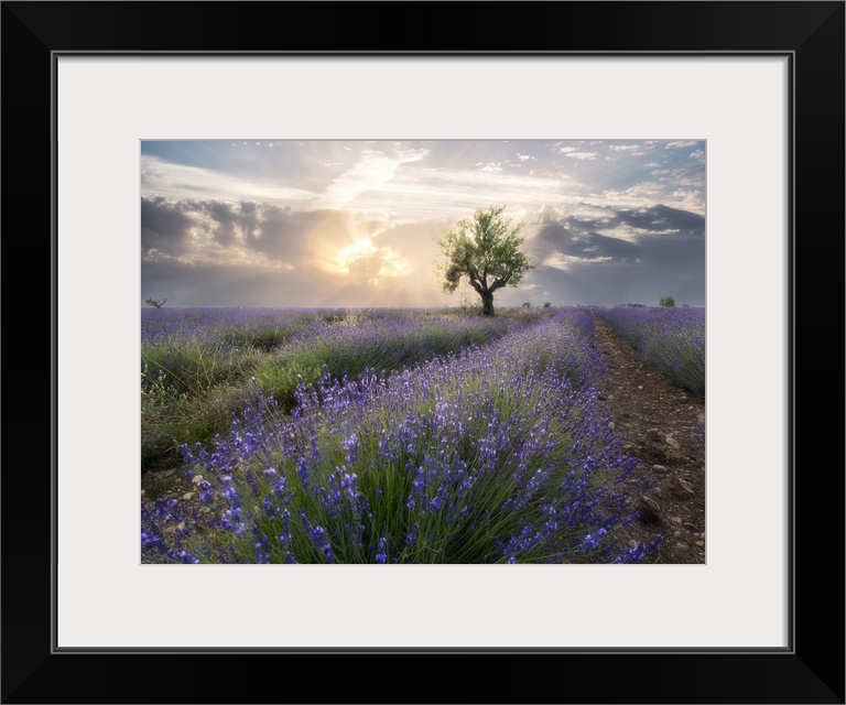 <p>A small tree at the end of a lavender line in a field at sunset with clouds in the sky, Plateau de Valensole, Provence, France, Europe</p>