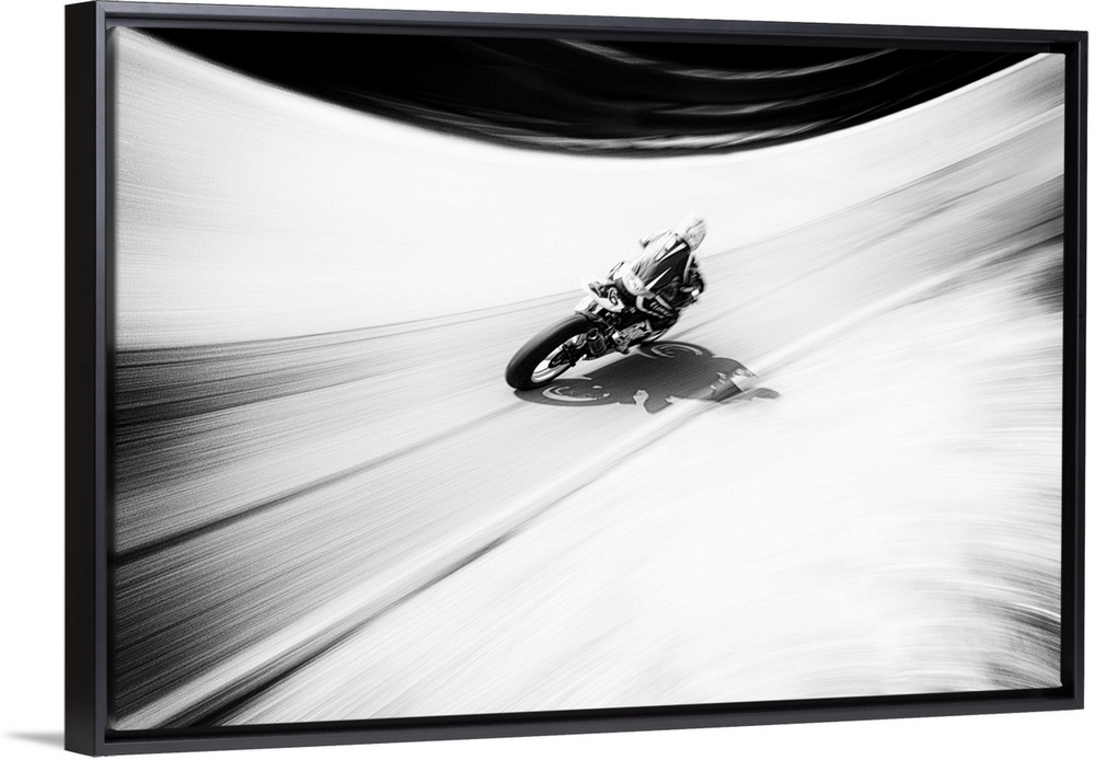 <p>A figure on a motorcycle traveling fast on a curved road.</p>