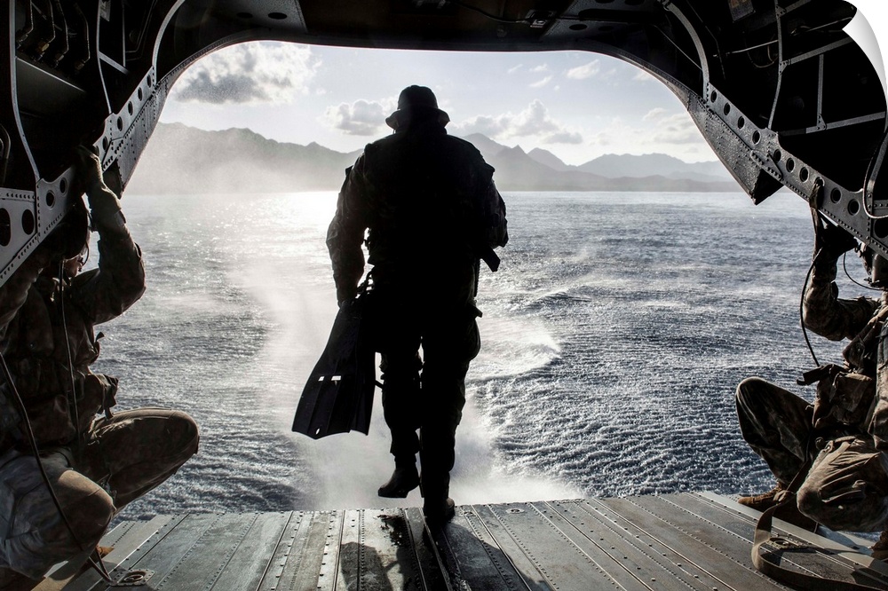 <p>A soldier conducts a combat dive mission off the back of a CH-47 Chinook.</p>