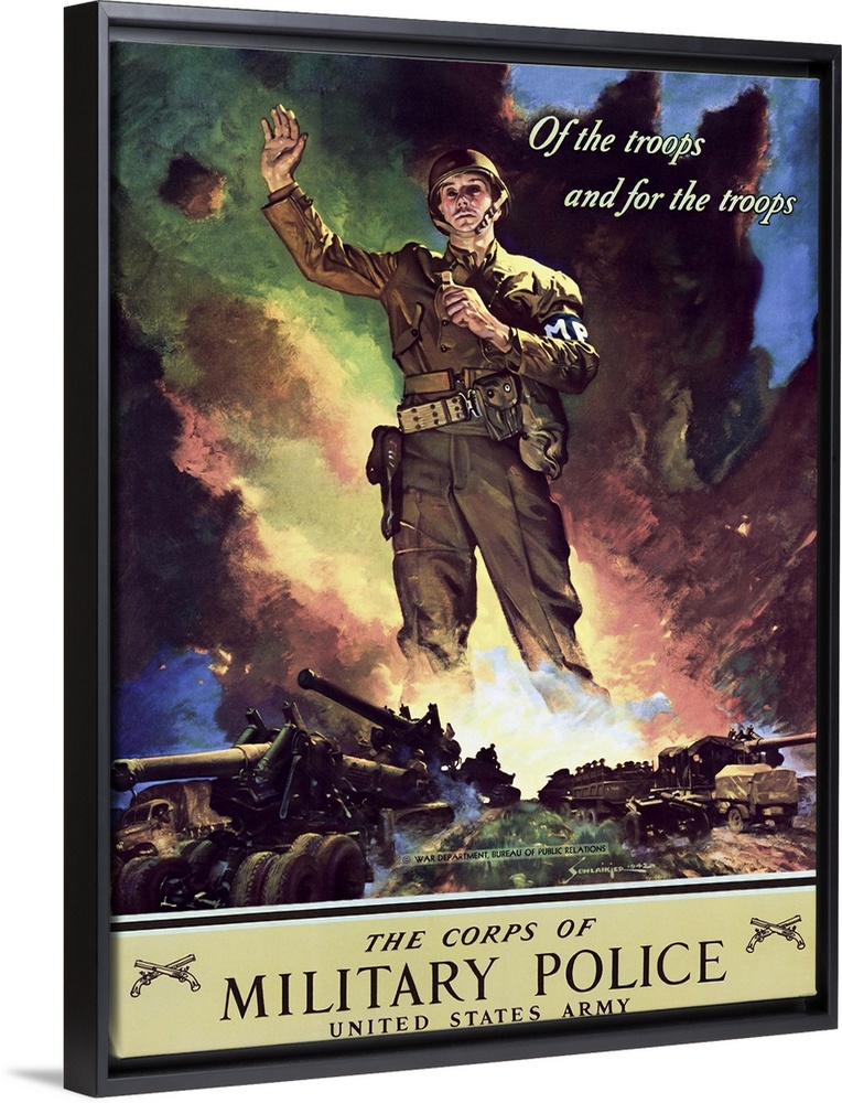<p>An American soldier of the Corps of Military Police of the U.S. Army standing with one hand raised and a whistle in his other hand, with trucks and transport vehicles driving over a hill below. --Since its inception the Military Police Corps has operated as the law enforcement branch of the U.S. Army and its uniformed men provide expertise in aspects like policing, detainment and stability with a view to improve security. Artwork by Jes Wilhelm Schlaikjer, 1942.-</p>