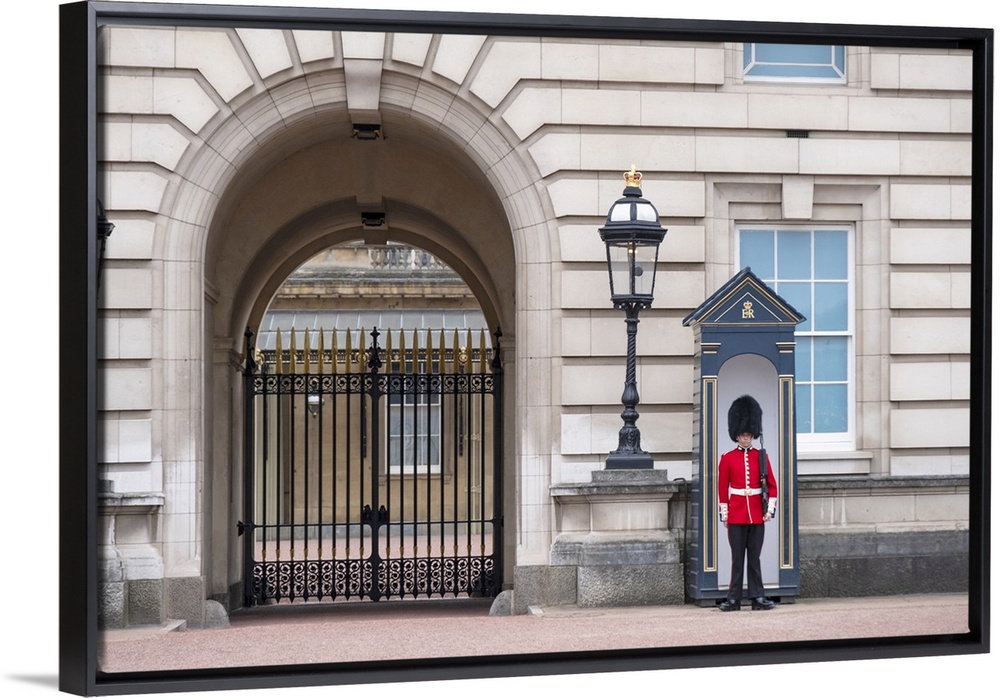 <p>United Kingdom, England, London, Buckingham Palace, A soldier of the Queen's Foot Guard on duty outside the palace</p>