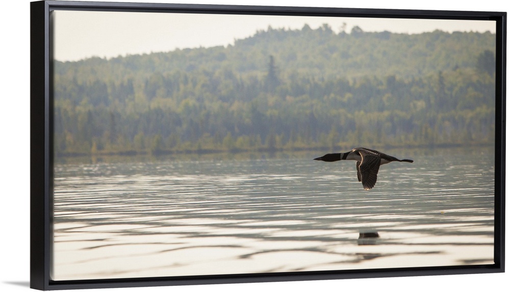 <p>A solitary Common Loon (Gavia immer) flying over Spencer Pond, in northern Maine.</p>