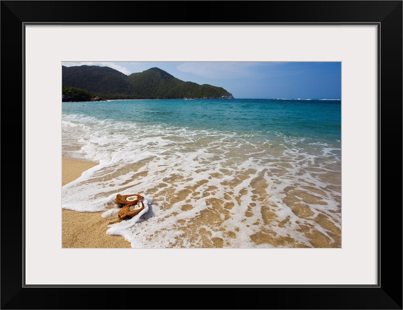<p>A split coconut washed ashore on a tropical beach.</p>