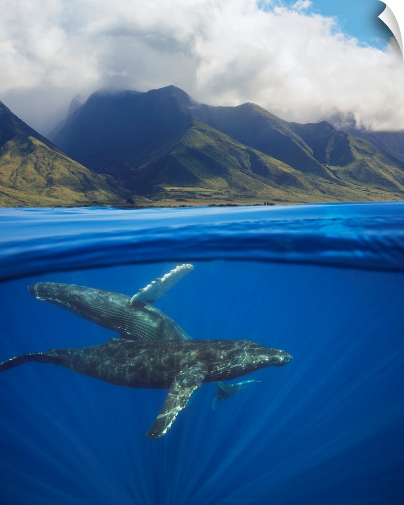 <p>A split image of a pair of humpback whales (Megaptera novaeangliae) underwater in front of the West Maui mountains, just south of Lahaina. Maui, Hawaii, United States of America.</p>