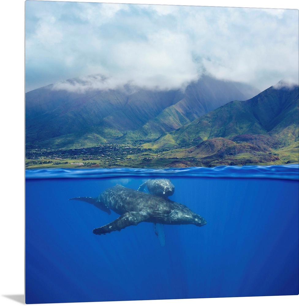 <p>A split image of a pair of humpback whales (Megaptera novaeangliae) underwater in front of the West Maui Mountains just south of Lahaina. Maui, Hawaii, United States of America.</p>