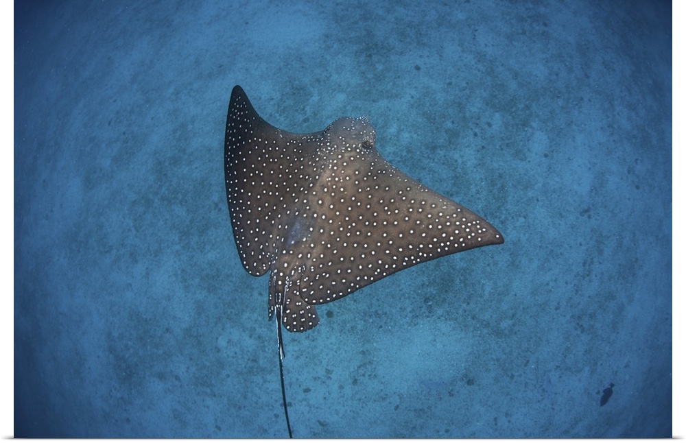 <p>A spotted eagle ray swims over the seafloor near Cocos Island, Costa Rica.</p>