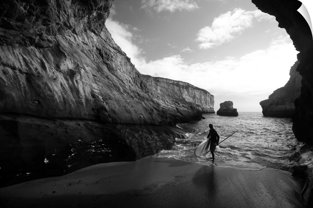 <p>A stand up paddleboarder on the rough coastline north of Santa Cruz.</p>