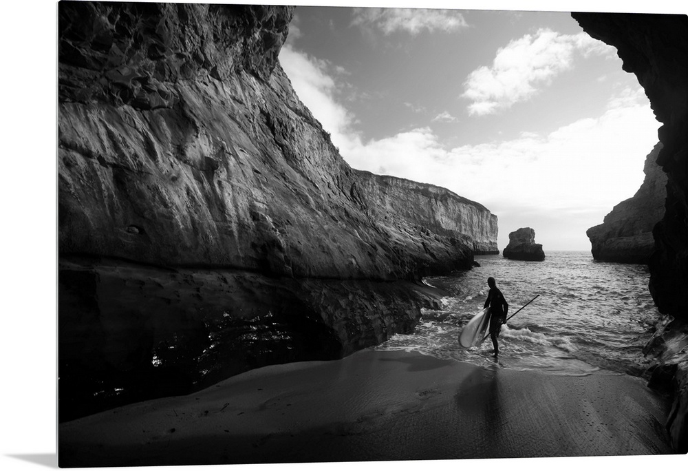 <p>A stand up paddleboarder on the rough coastline north of Santa Cruz.</p>