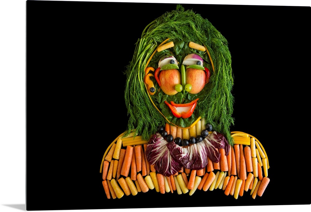 <p>A still life of a person made with fruits and vegetables.</p>