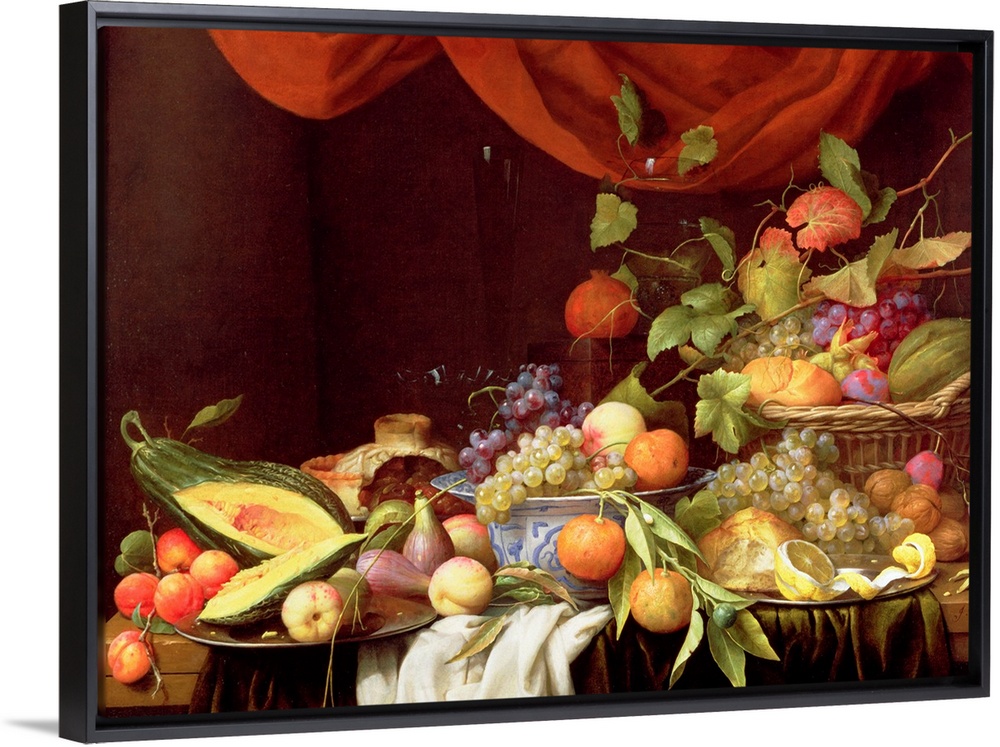 <p>Horizontal, still life painting of a variety of fruits and leaves spread amongst a table in bowls, baskets and plates. A large fabric drapes down the wall in the background.</p>