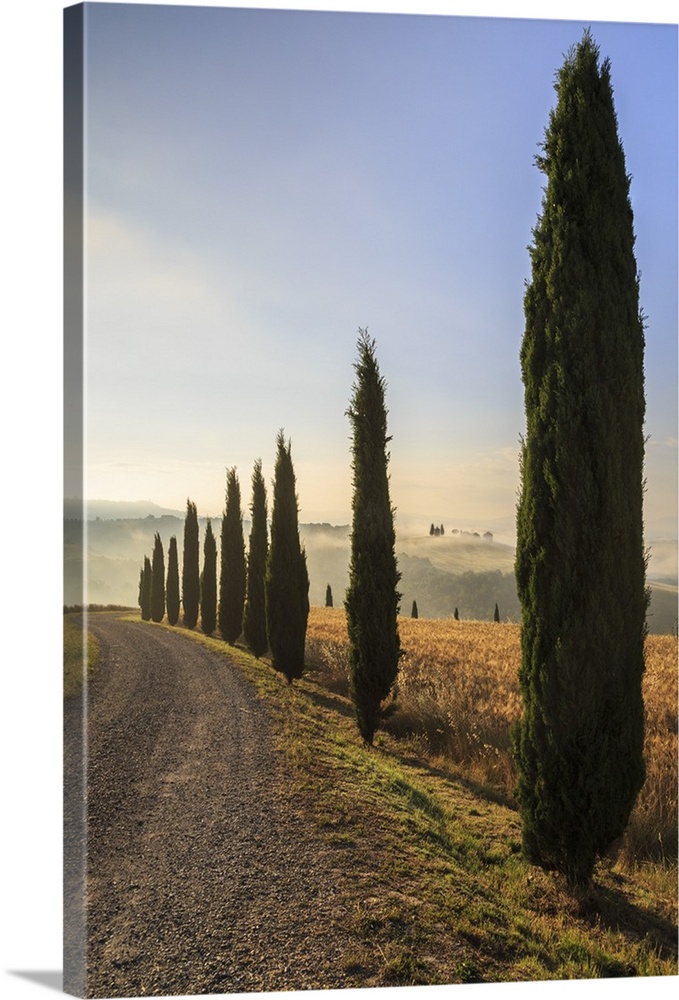 <p>A typical street in Tuscany, with cypresses and in the background the chapel of Vitaleta. Val d'orcia, Italy, Europe.</p>