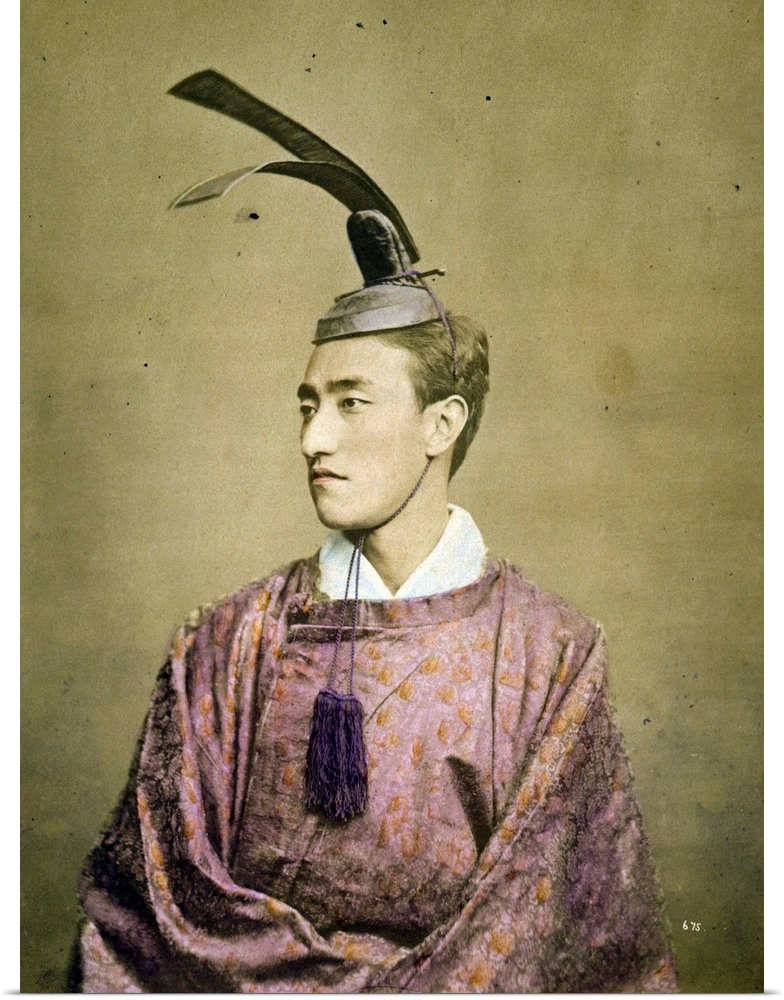 <p>Photographic print, hand coloured with watercolour. Photograph shows a halflength studio portrait of a court official wearing a kanmuri (or kammuri), a crownlike hat worn by nobles and/or court officials.</p>