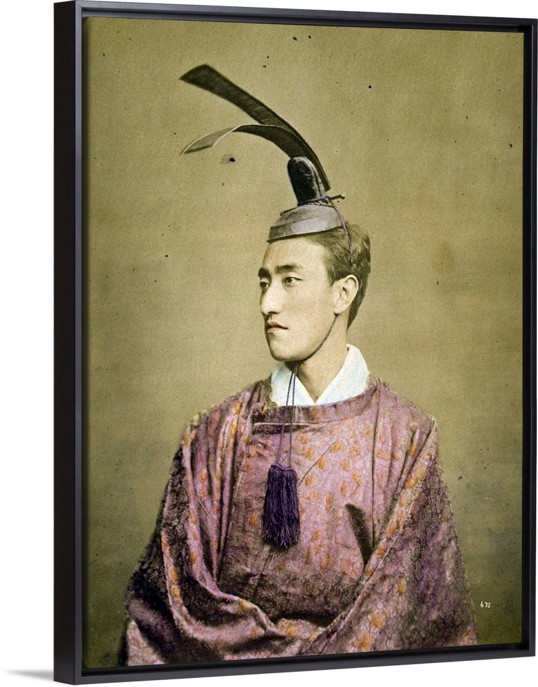 <p>Photographic print, hand coloured with watercolour. Photograph shows a halflength studio portrait of a court official wearing a kanmuri (or kammuri), a crownlike hat worn by nobles and/or court officials.</p>