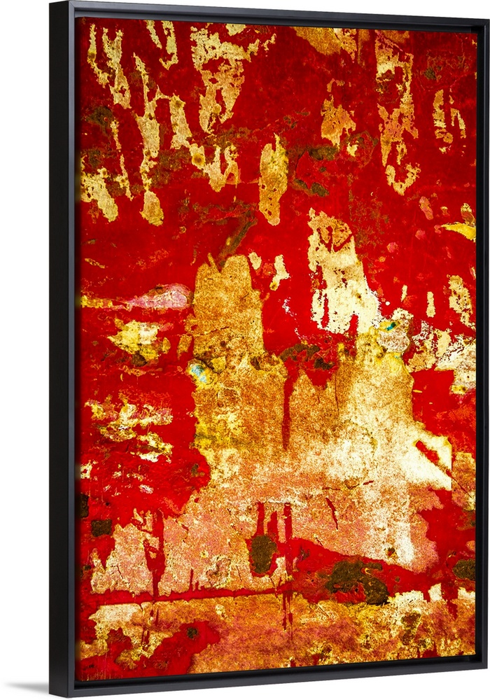 <p>Close up of graffiti on a wall, creating an abstract image in red and gold.</p>