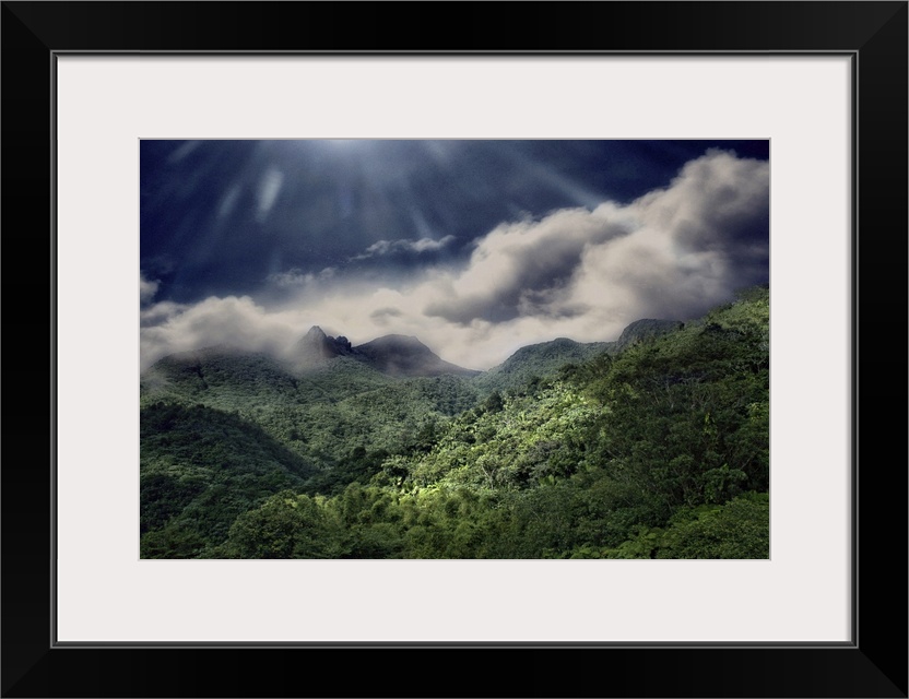<p>A sunny day in El Yunque National Park in Puerto Rico with clouds and fog on the rain forest</p>