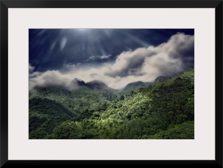 <p>A sunny day in El Yunque National Park in Puerto Rico with clouds and fog on the rain forest</p>