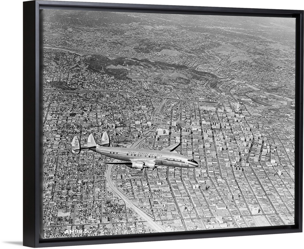 <p>A Super Constellation flying over downtown Los Angeles. The ribbon like roadway directly beneath the plane is the city's newest section of superhighway providing uninterrupted travel through the metropolis. Just above the center, the highway sprouts into three other freeways, to Hollywood at the left, through the Arroyo Sec. to Pasadena at the top, and to southeast Los Angeles, at right center, through the Civic Center past the towering City Hall. A third transport form is depicted at right center at the city's Union Station and railroad yards. The freeway junctions at one point has four roadways, one above the other, for nonstop transfer of traffic between the high speed arteries.</p>