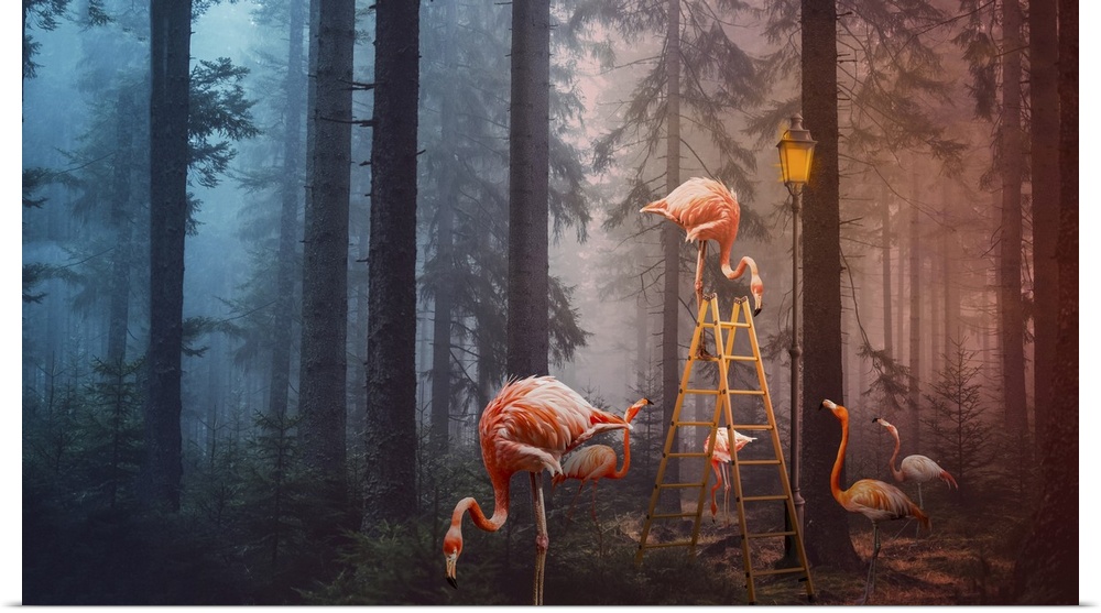 <p>A surreal composite image of flamingoes in a forest with a ladder and lamp post.</p>