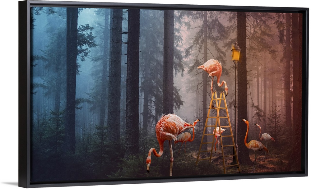 <p>A surreal composite image of flamingoes in a forest with a ladder and lamp post.</p>