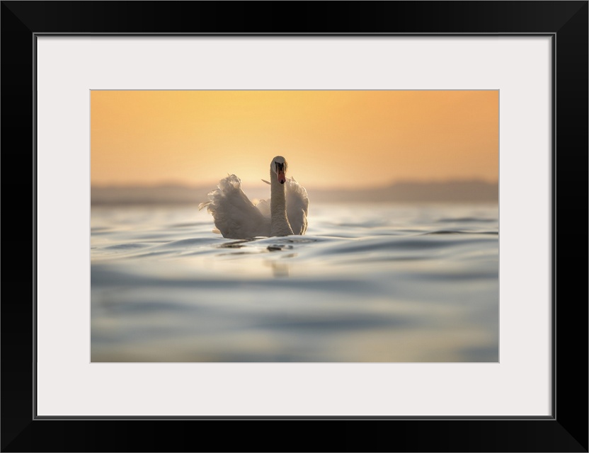 <p>A swan is floating on the surface of water into lake Garda during sunset. Lazise, Garda lake, Veneto, Italy</p>