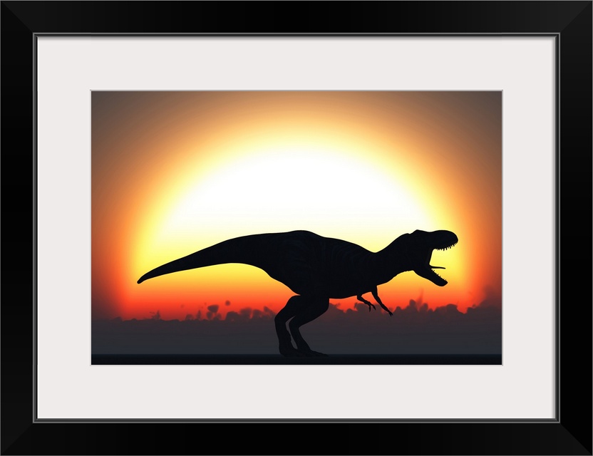 <p>A T. Rex silhouetted against the setting Sun at the end of a prehistoric day.</p>