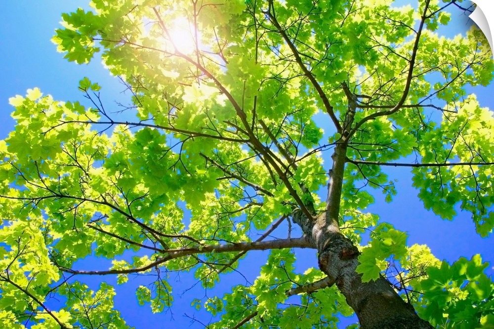 <p>A photograph is taken from the base of a tree and looking up through its branches where the sun is shining through.</p>