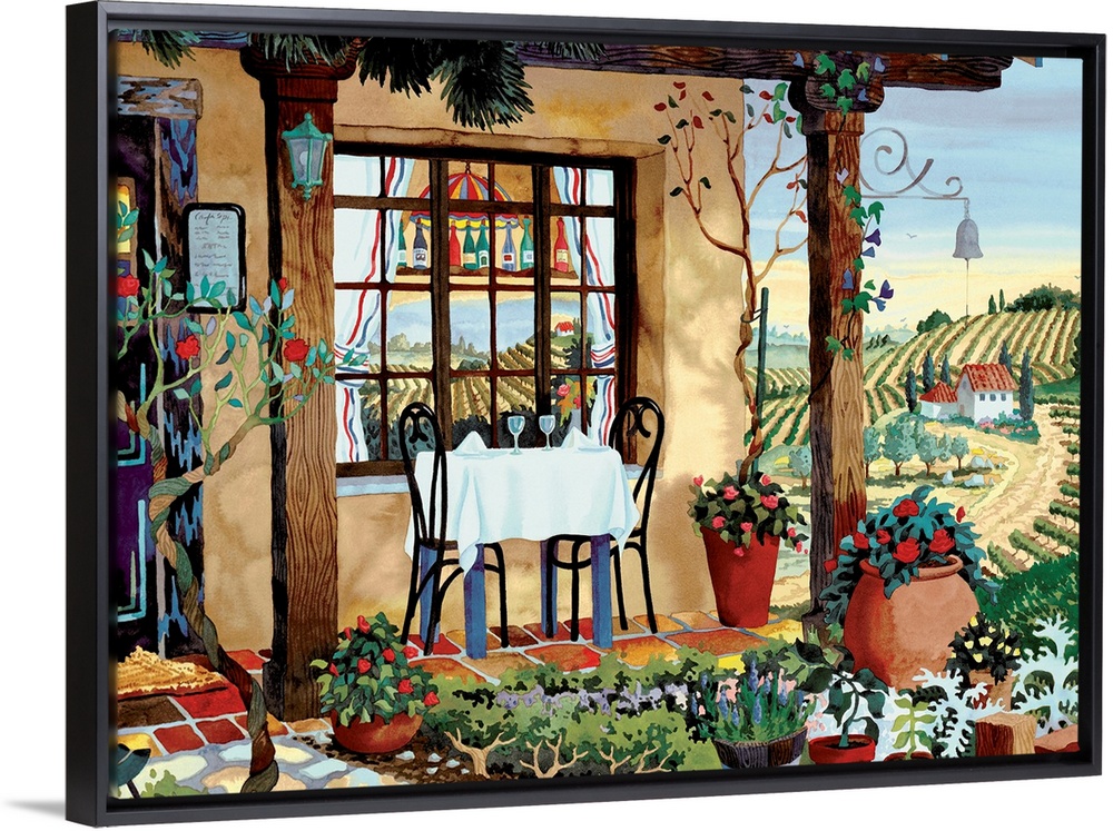<p>Large canvas painting of a vineyard with a small restaurant in the foreground and a flower garden.</p>