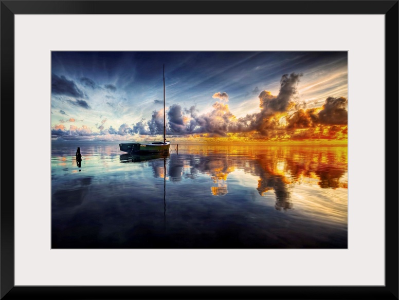 <p>Dramatic clouds of sunset hanging over a reflective waterscape with a sailboat sitting in the foreground.</p>