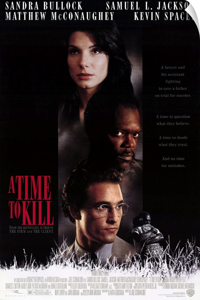 <p>Powerful story of revenge, racism, and the question of justice in the new south. John Grisham had a lot of clout when he finally sold his first and favorite novel to the movies, including veto power over the leading man--director Schumacher was for Woody Harrelson, Grisham was opposed but both finally agreed on newcomer McConaughey. He's outstanding as idealistic smalltown Mississippi lawyer Jake Brigance, called to defend anguished father Carl Lee Hailey (Jackson), who's accused of killing the rednecks who raped his young daughter. Jake's assisted by former mentor Lucien Wilbanks (Sutherland) and ambitious northern law student Ellen Roark (Bullock) against ruthless prosecutor Rufus Buckley (Spacey). Is it emotionally manipulative? You betcha. But Grisham's done well on screen and Schumacher (who also did The Client) knows how to get the most from his cast and script.</p>