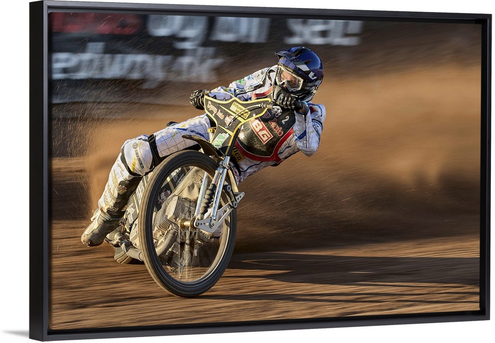 <p>A motocross racer learning into a curve at the Fjelsted Speedway, Denmark.</p>