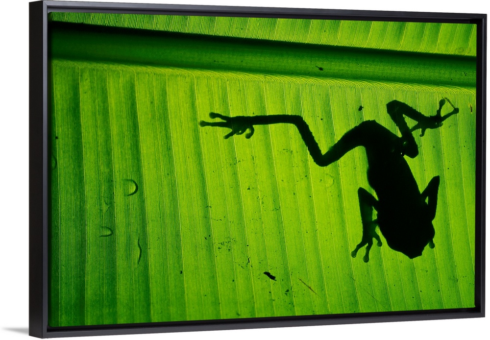 <p>A photograph is taken from underneath a large leaf where you can see the silhouette of a tree frog.</p>