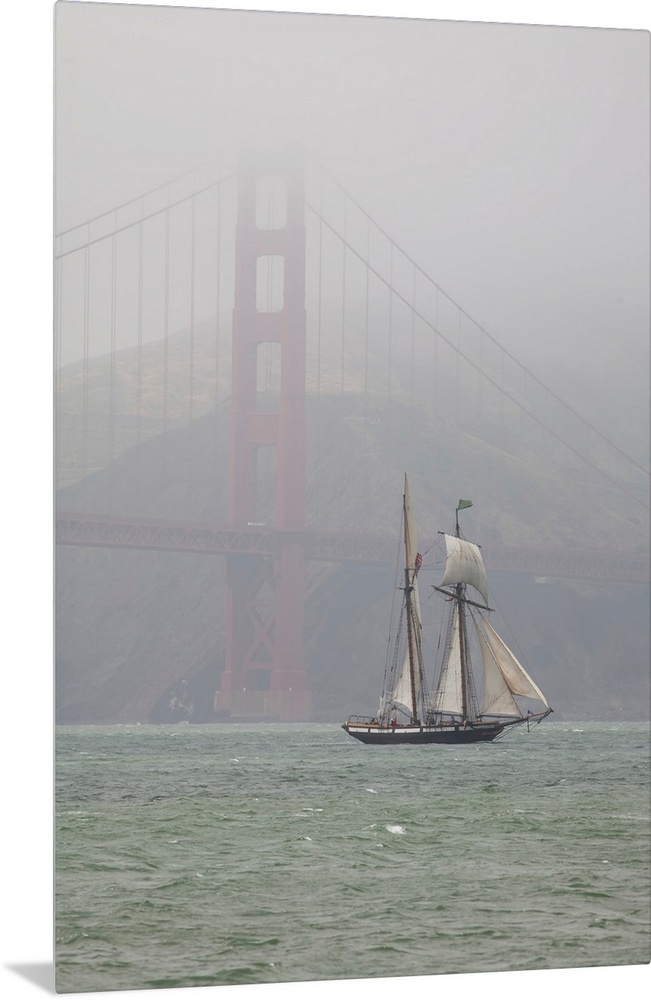 <p>A two masted schooner sails under the Golden Gate Bridge.</p>