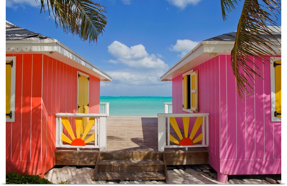 <p>Two colorful cabanas sit on the beach and have a small walking path in between that leads down to the water.</p>