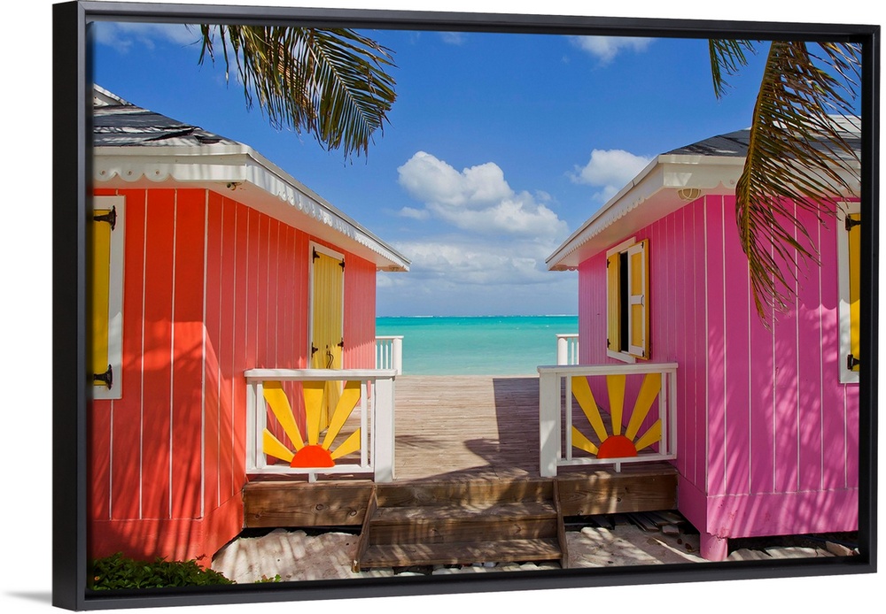 <p>Two colorful cabanas sit on the beach and have a small walking path in between that leads down to the water.</p>