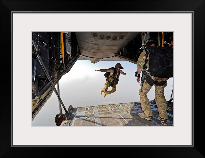<p>July 30, 2012 - A U.S. Air Force pararescueman jumps out of the back of an HC-130P Combat King aircraft over the Grand Bara Desert, Djibouti.</p>