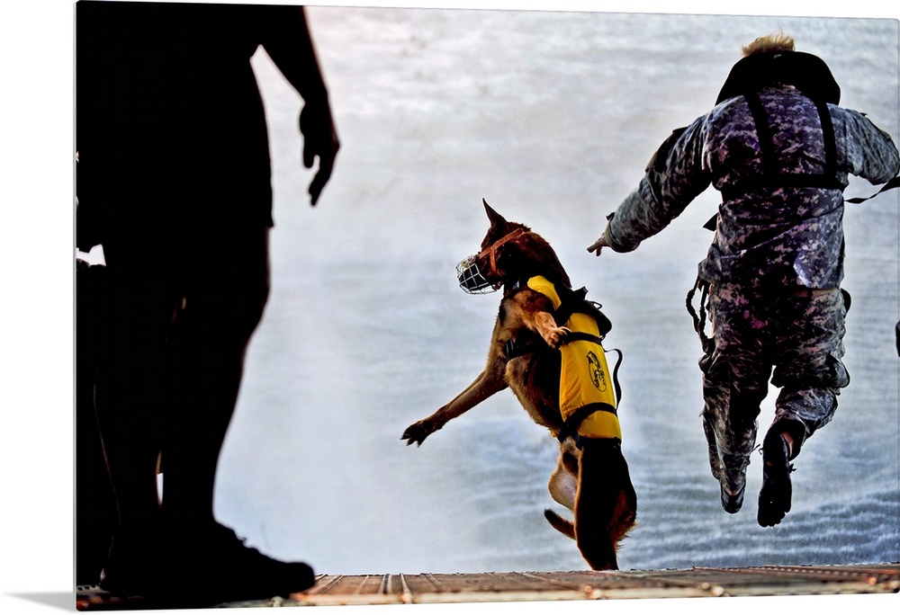 <p>March 1, 2011 - A U.S. Soldier with the 10th Special Forces Group and his military working dog jump off the ramp of a CH-47 Chinook helicopter during water training over the Gulf of Mexico, as part of exercise Emerald Warrior 2011.</p>