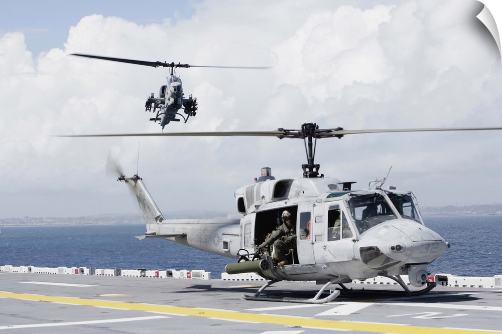 <p>A UH-1N Huey and an AH-1W Super Cobra land on flight deck of USS Essex.</p>
