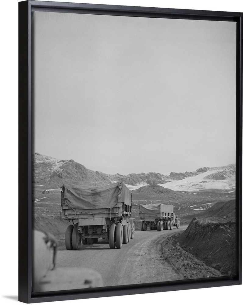 <p>A United States Army truck convoy carrying supplies for Russia climbing a snowbound mountain pass somewhere in the Persian corridor. Iranian road workers struggle to keep the pass open, 1943.</p>