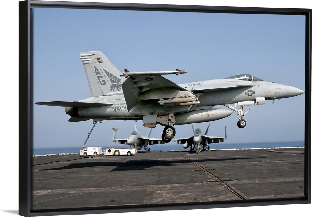 <p>A US Navy F/A-18E Super Hornet descends to make an arresting gear landing aboard USS Eisenhower. USS Eisenhower is operating in the 5th fleet area of responsibility off the coast of Pakistan.</p>
