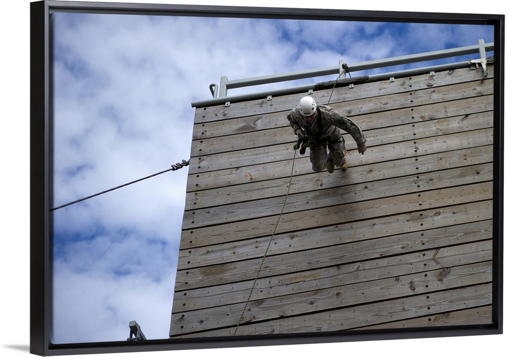 <p>January 17, 2013 - A U.S. Soldier runs down a 40-foot rappelling wall at the training tower at Eglin Air Force Base, Florida. The Green Berets practiced descending a 40-foot rope and wall designed to maintain the ability to fast rope out of helicopters onto objectives.</p>