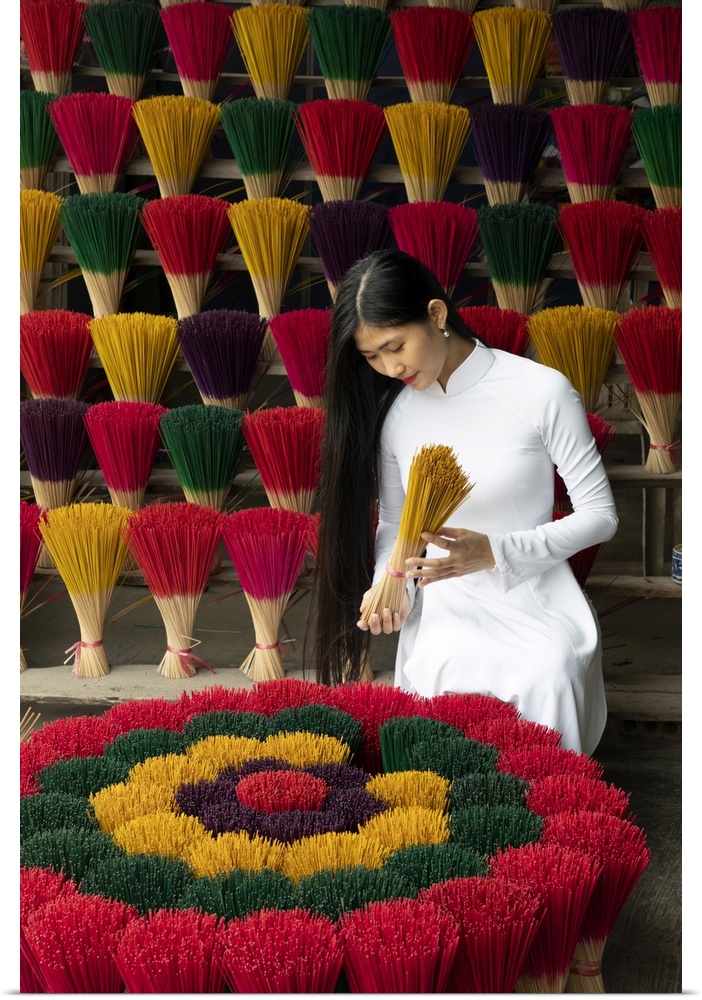 <p>A Vietnamese woman holds colourful incense sticks in a shop, Hue, Thua Thien-Hue province, Vietnam.</p>