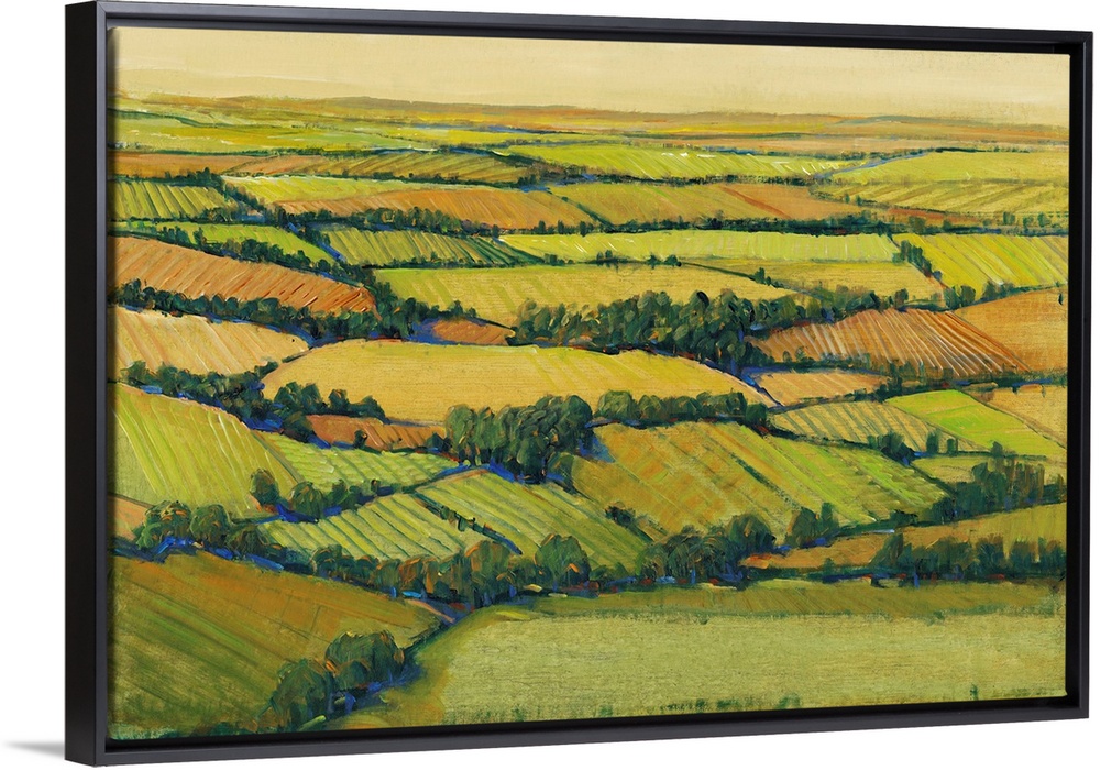 <p>Contemporary landscape painting of verdant farm fields.</p>