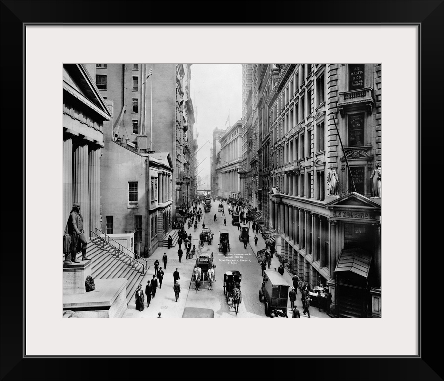 <p>A view down Wall Street from Nassau Street in New York City. Photograph, c1911.</p>