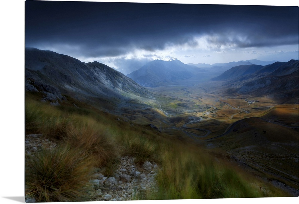 <p>A view from the high peak of the mountain near the Rifugio Duca Degli Abruzzi, 2388m, Campo Imperatore, Abruzzo, Italy, Europe.</p>