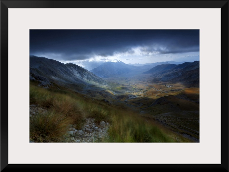 <p>A view from the high peak of the mountain near the Rifugio Duca Degli Abruzzi, 2388m, Campo Imperatore, Abruzzo, Italy, Europe.</p>
