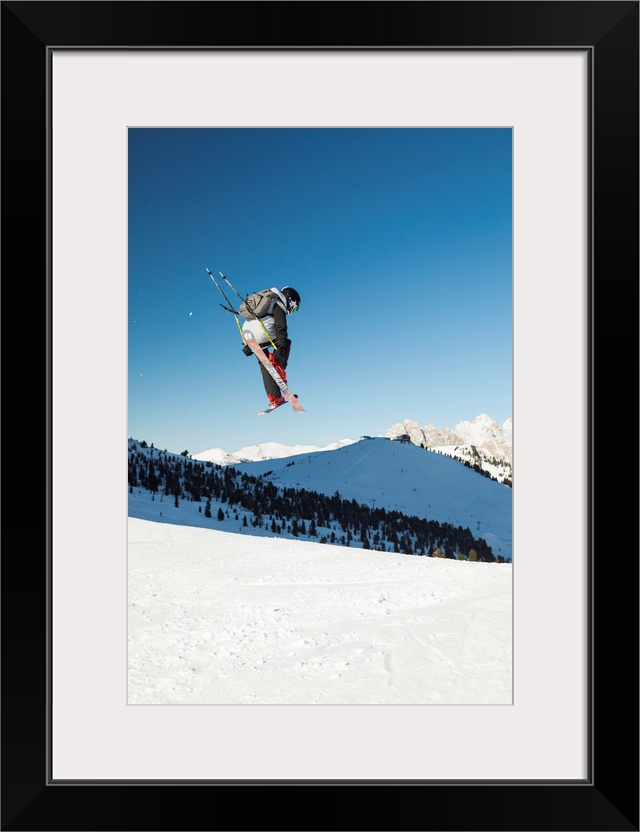 <p>A View Of A Freestyler Flying With His Skis After A Jump In Val Gardena, Bolzano Province, South Tyrol, Trentino Alto Adige, Italy</p>