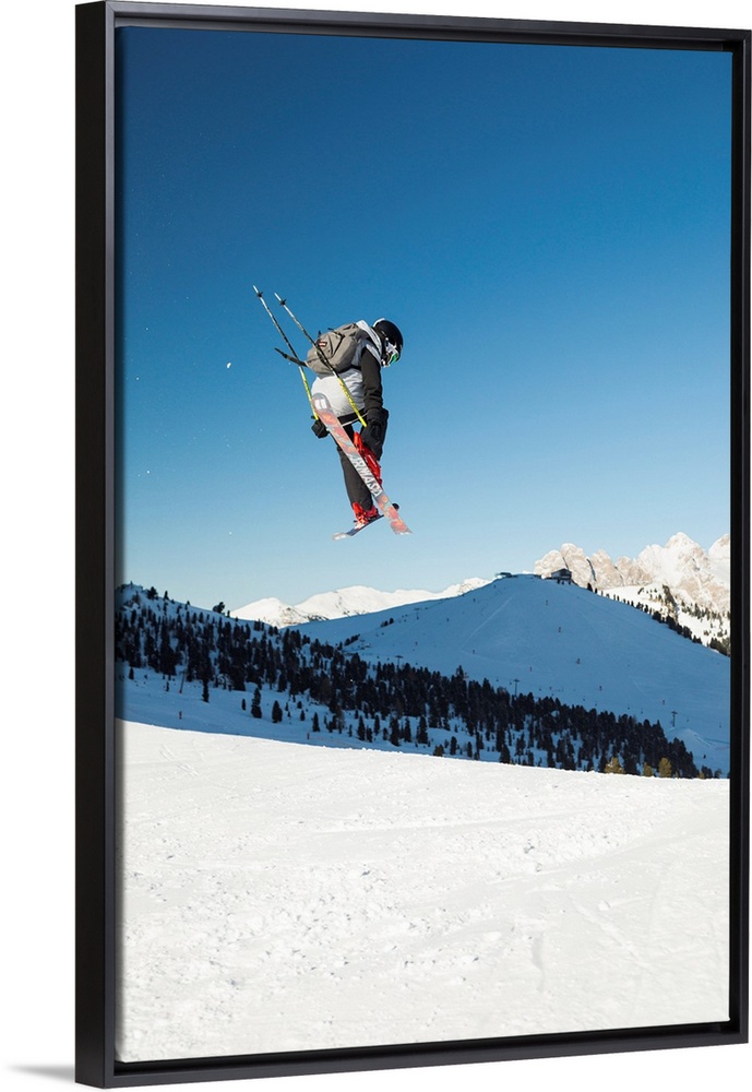 <p>A View Of A Freestyler Flying With His Skis After A Jump In Val Gardena, Bolzano Province, South Tyrol, Trentino Alto Adige, Italy</p>